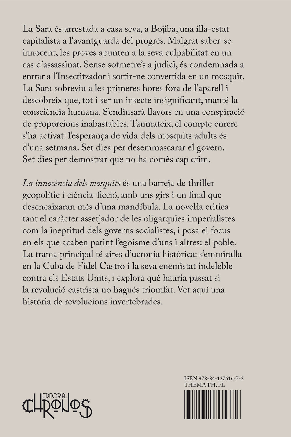 La innocència dels mosquits és una barreja de thriller geopolític i ciència-ficció, amb uns girs i un final que desencaixaran més d’una mandíbula. La novel·la critica tant el caràcter assetjador de les oligarquies imperialistes com la ineptitud dels governs socialistes, i posa el focus en els que acaben patint l’egoisme d’uns i altres: el poble. La trama principal té aires d’ucronia històrica: s’emmiralla en la Cuba de Fidel Castro i la seva enemistat indeleble contra els Estats Units, i explora què hauria passat si la revolució castrista no hagués triomfat.