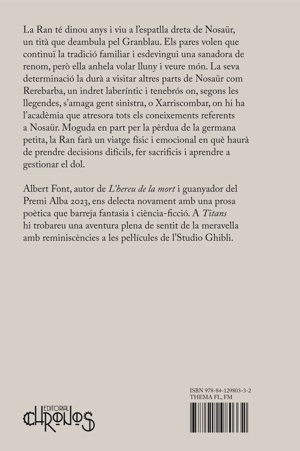 Albert Font, autor de L’hereu de la mort i guanyador del Premi Alba 2023, ens delecta novament amb una prosa poètica que barreja fantasia i ciència-ficció. A Titans hi trobareu una aventura plena de sentit de la meravella amb reminiscències a les pel·lícules de l’Studio Ghibli.